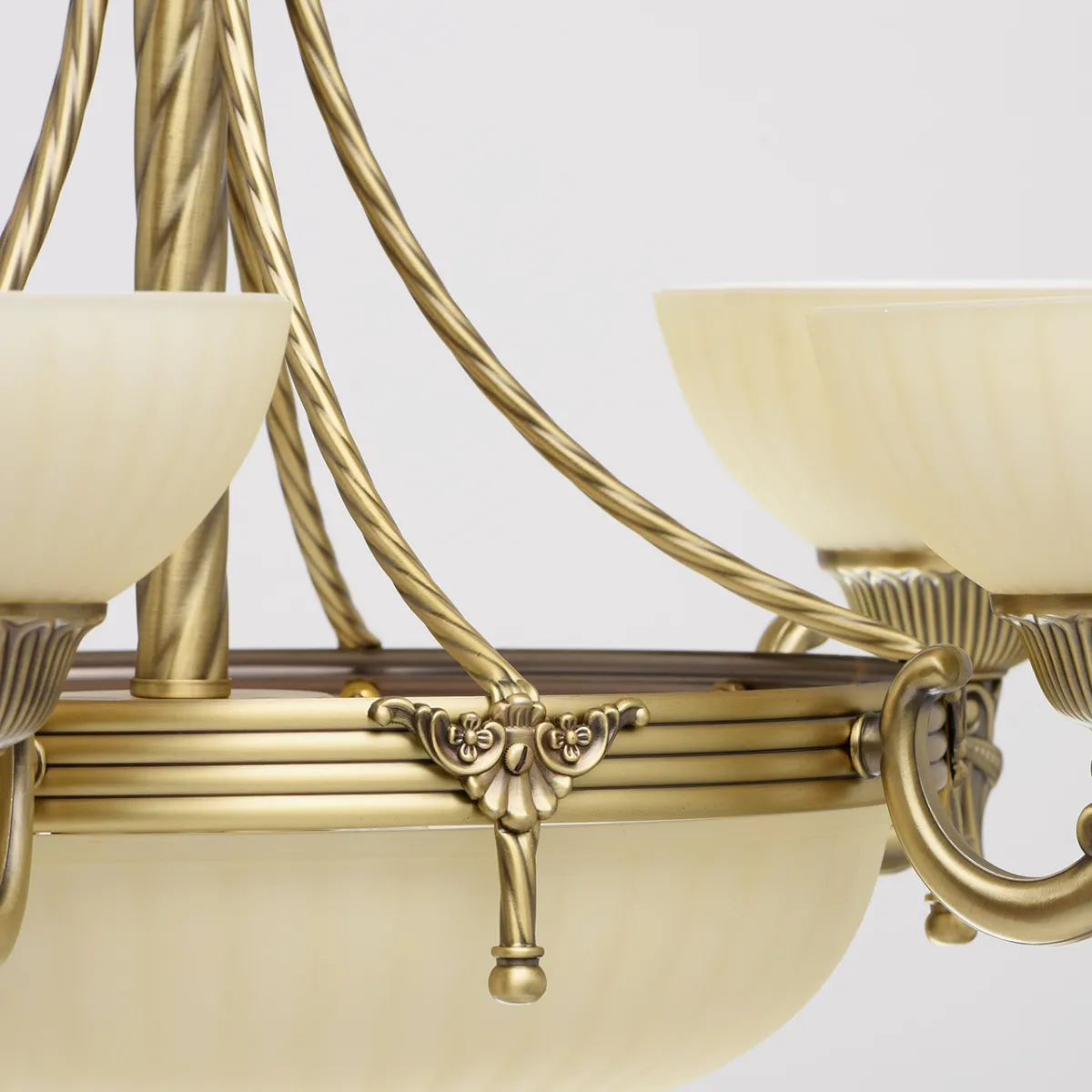 Алюминиевое основание цвета античной бронзы, стекляные плафоны цвета ванили.